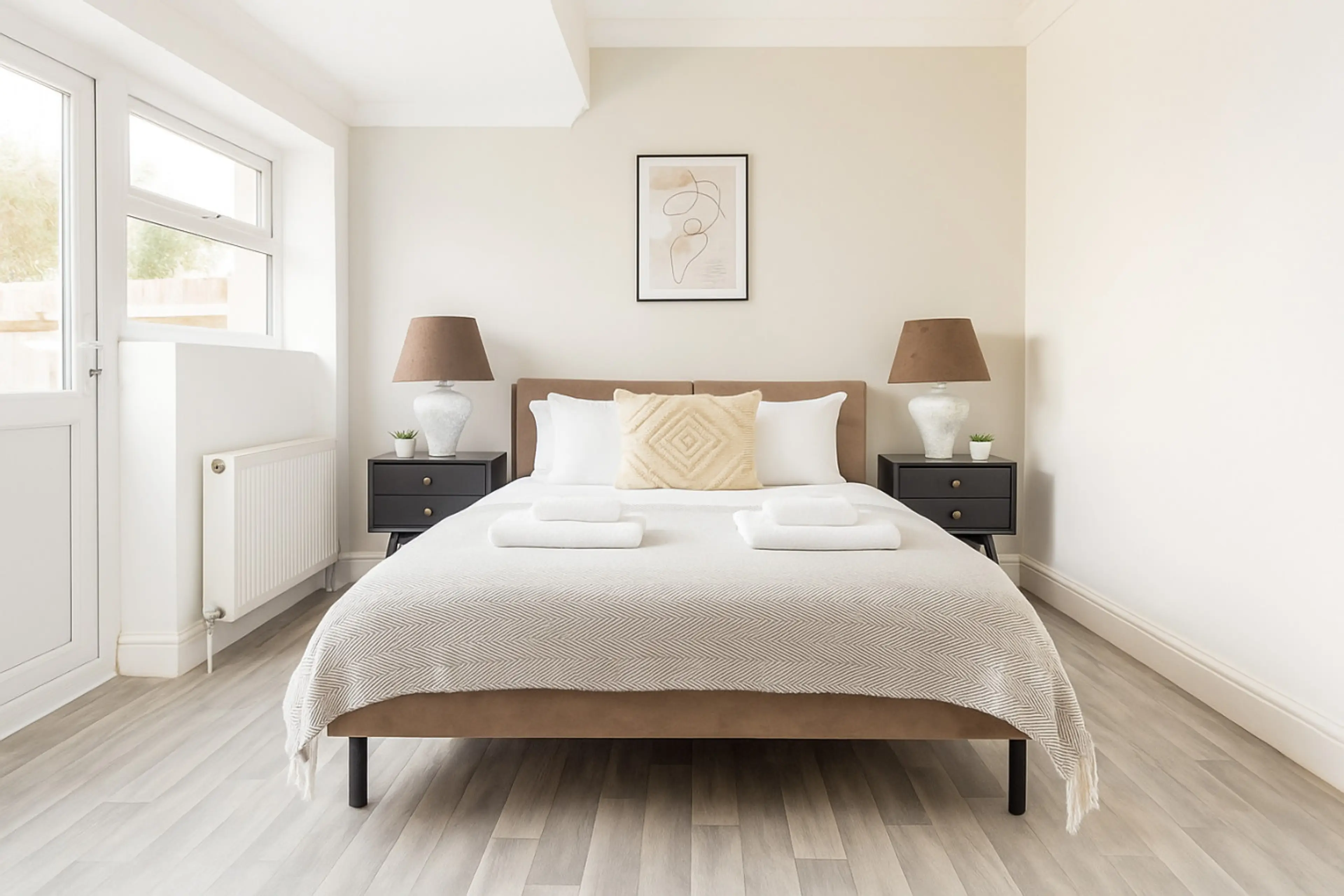 Enjoy a comfortable stay in this modern and bright 2-bedroom apartment, perfect for families, friends, or business travelers. Each bedroom features a king-size bed, offering plenty of space and comfort for a restful night’s sleep. The apartment also includes a cozy living room, a fully equipped kit...